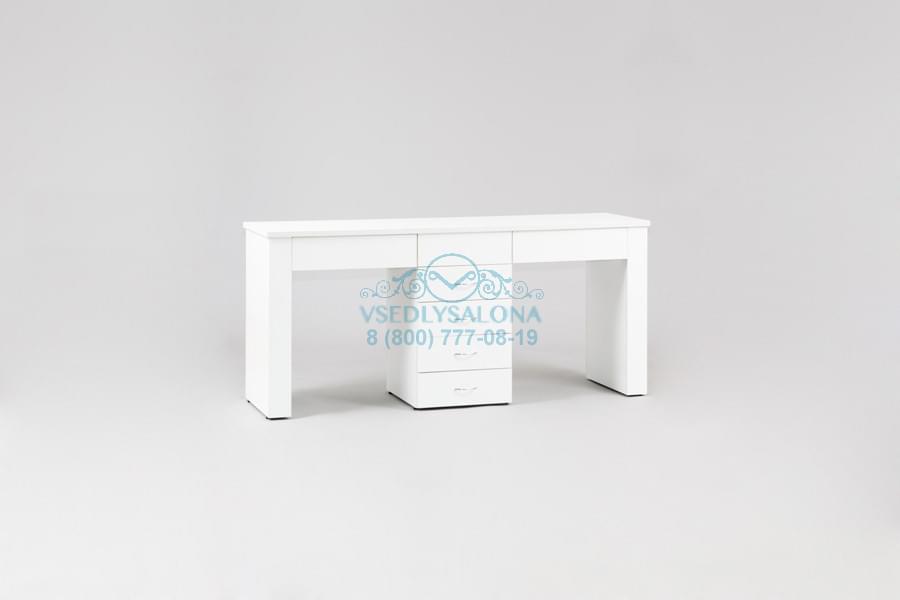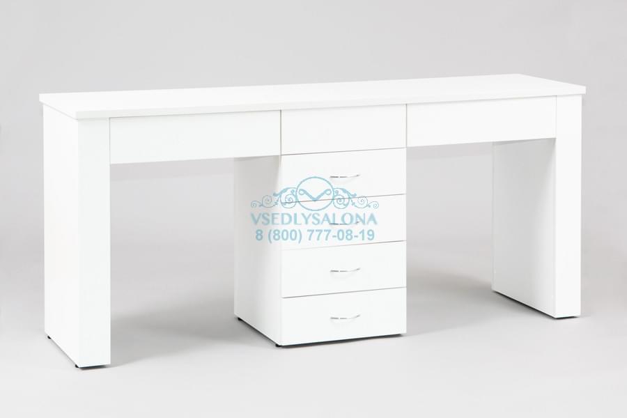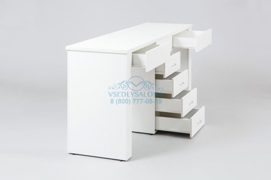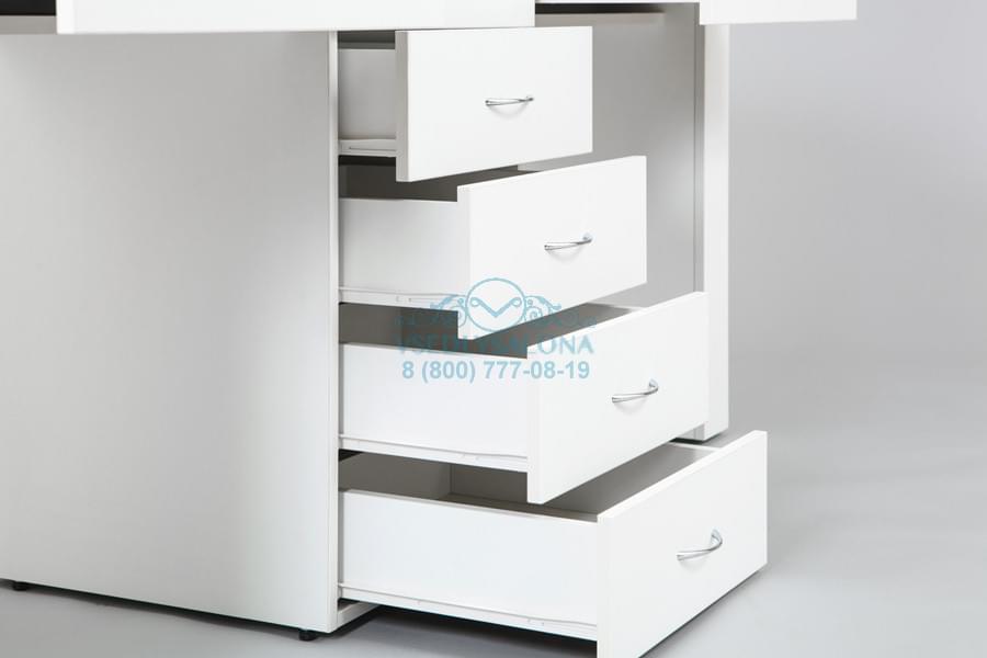 Оснащен тумбой с четырьмя выдвигающимися ящиками и двумя индивидуальными ящиками для каждого мастера маникюра. Конструкция стола сочетает плиты Egger (Австрия) толщиной 25 мм и 16 мм, обеспечивающие жесткость конструкции.