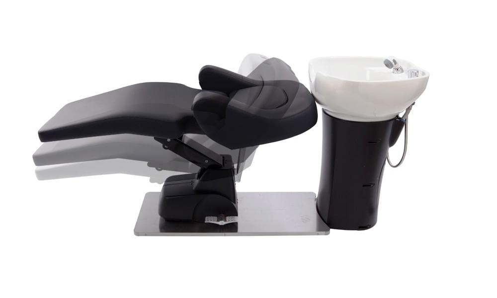 Кресло этой парикмахерской СПА-мойки может вращаться на 270 градусов. Ножные педали управления креслом находятся с обеих сторон. Воротничок на раковине и мягкая подушечка для поддержки головы позволяют клиенту получать процедуры в комфорте. При повороте кресла от раковины мастер может использовать подголовник.