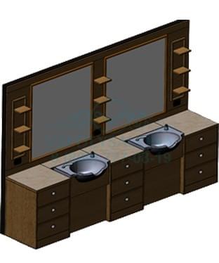 Классическое рабочее место Tivoli 2 для барбершопа на два рабочих места. Данная комплектация включает в себя: два настенных зеркала в раме из ламината; 9 настенных полок; 2 встроенные регулируемые раковины для мытья волос; три тумбы с тремя выдвижными ящиками, отделка ламинат; столешница из ламината оттенок "тиволи".
