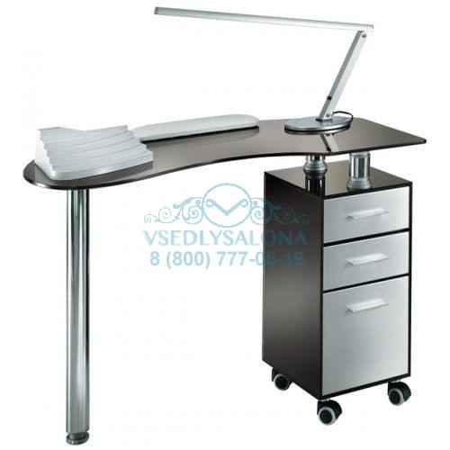 Маникюрный стол с одной тумбой, столешница из стекла, тумба из стекла с тремя выдвижными ящиками из металла, на колесах. В комплекте: лампа, подушка маникюрная, подставка под лаки.