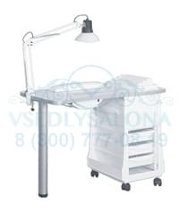 Итальянский маникюрный стол с вытяжкой, одной тумбой и белой ламинированной столешницей. Тумба пластиковая на колесах с выдвижными ящиками. В комплекте: лампа, подушка для маникюра, подставка для лаков. Размер (ДхШхВ): 980х480x740 мм
