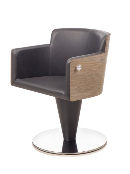 Дизайнерское парикмахерское кресло. Кресло для клиента комплектуется дисковым основанием из нержавеющей стали и гидроподъемником с блокировкой. Отделка каркаса кресла - ламинат "под дерево", отделка гидроподъемника - искусственная кожа. Кресло оснащено комфортными подлокотниками и декоративной ручкой для подвешивания сумок, обеспечивая клиенту максимальный комфорт. Обивка - искусственная кожа высшего качества.