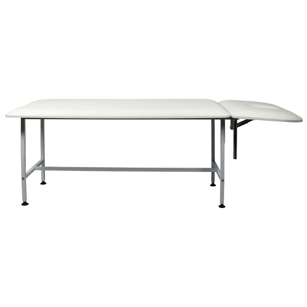 Неоспоримым преимуществом данной модели кушетки является надежный металлический каркас, который обеспечивает необходимую устойчивость даже при больших нагрузках. Для защиты от коррозии он окрашен порошковой краской белого цвета. Ножки каркаса установлены на специальные подпятники. Учитывая специфику массажных процедур, в подголовнике кушетки предусмотрено отверстие для лица. Для дополнительного удобства клиентов мастер сможет отрегулировать наклон подголовника с помощью механического рычага.
