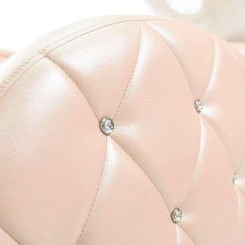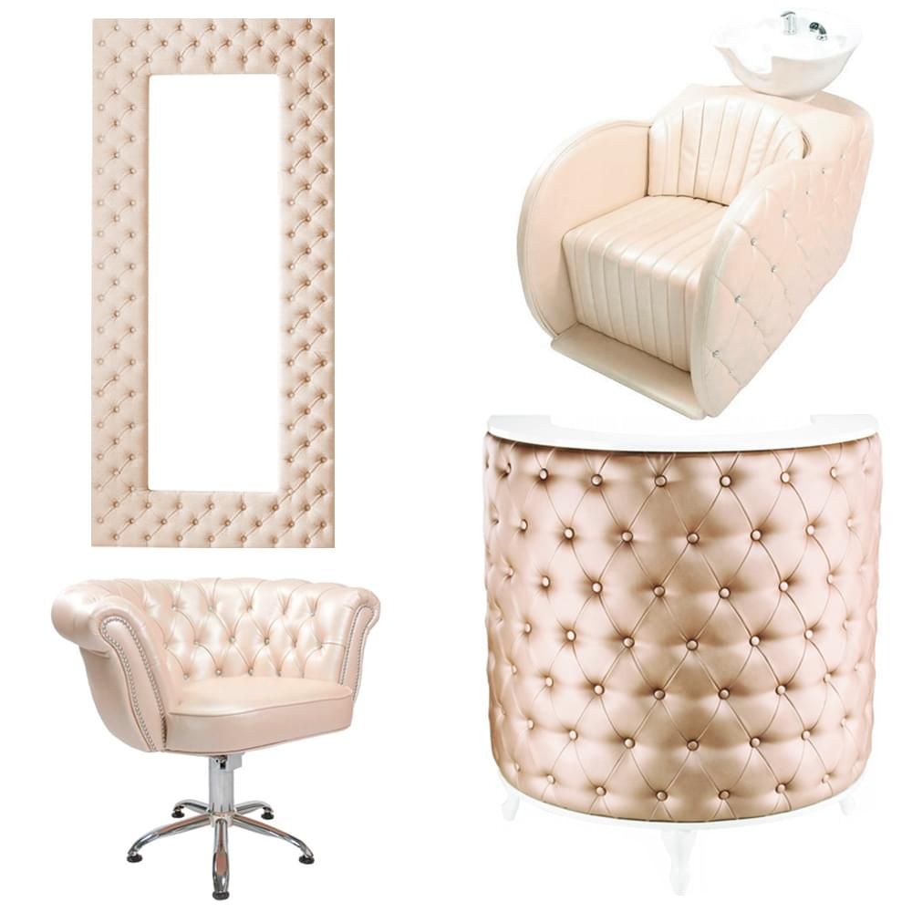 Парикмахерский комплект «Mia» - нежный, утонченный и функциональный набор мебели для создания девичьего интерьера. В комплект входит четыре предмета: полукруглая стойка администратора, парикмахерское кресло, парикмахерская мойка, вертикальное зеркало. Обивка всех предметов выполнена из искусственной кожи нежного розового цвета. Также при производстве используется хромированная сталь и ламинированный ДСП.