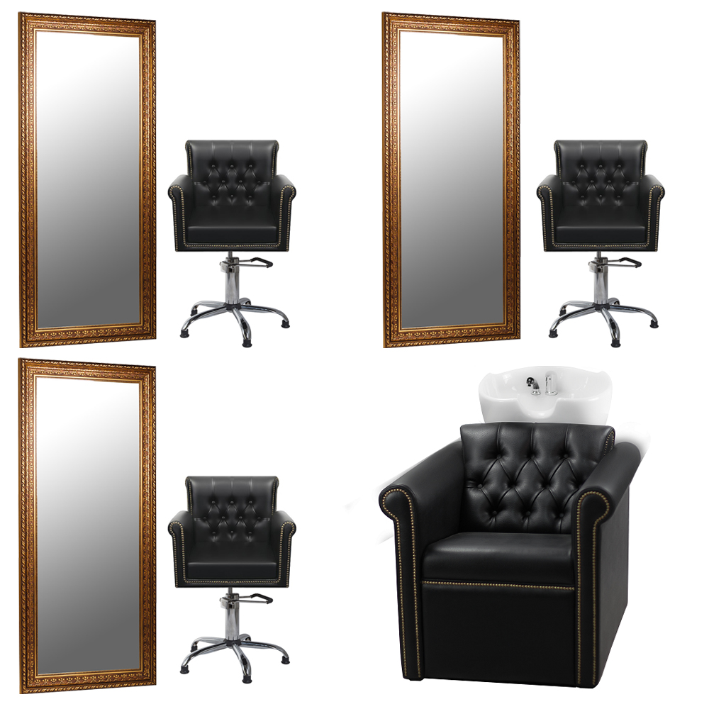 Парикмахерский комплект «Рок» - стильный и элегантный набор мебели, который прекрасно впишется как в мужской, так и женский зал. Комплект состоит из семи предметов: трех парикмахерских кресел, трех парикмахерских зеркал, одной мойки, которая комплектуется мягким креслом. Вся мебель изготовлена в сдержанном дизайне, в качестве декора выступает каретная стяжка, выполненная на спинке кресел.