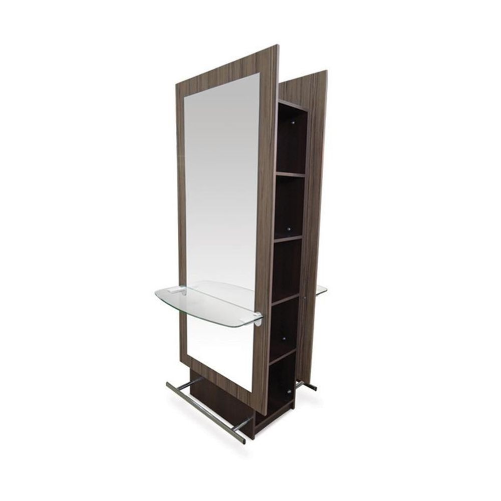 Парикмахерское зеркало Тео 2-х стороннее – симпатичное, внушительное по массе изделие, где в парикмахерском деле применяются две стороны. Это увеличивает шансы быть на уровне конкуренции и в любой момент подсмотреть фишки соседа мастера, который трудится на противоположной стороне. Этот комплект состоит из стеклянной столешницы, двух зеркал, множества полок, минимум четыре и двух стеллажей. Хромированная подножка создана на основе эллипса, трубы похожего типа.