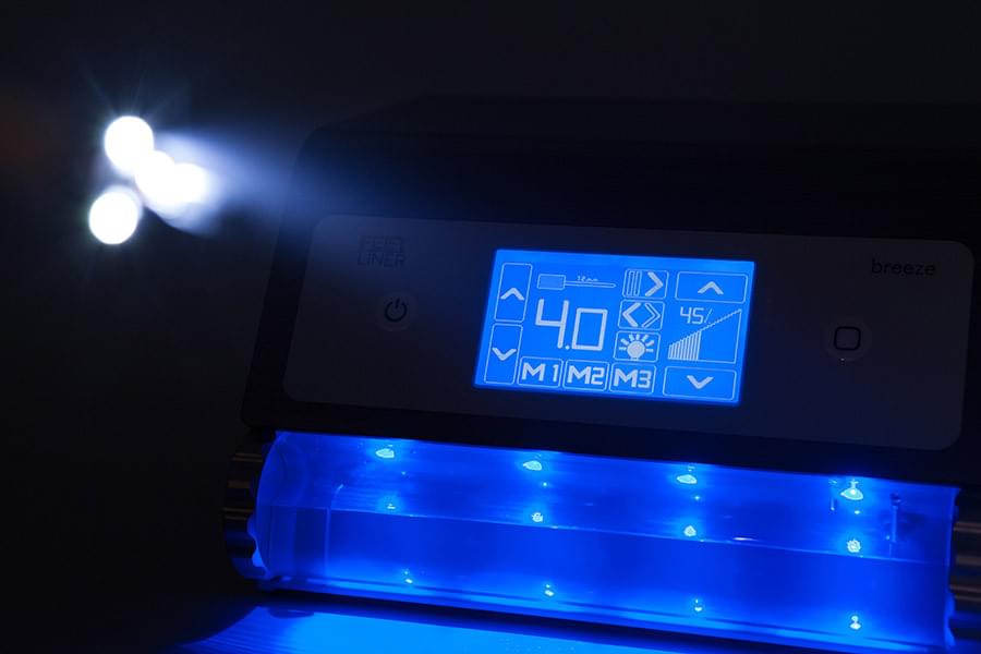Аппарат отличается функцией спрея и наконечником со встроенной LED подсветкой с тремя светодиодами. Все настройки педикюрного аппарата регулируются при помощи сенсорного дисплея на лицевой панели. Модель оснащена тремя настраиваемыми ячейками памяти для быстрого перехода к собственным настройкам скорости вращения фрезы и интенсивности спрея.