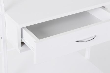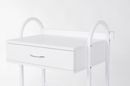 Столик для профессионального использования на металлическом каркасе белого цвета с двумя полками из ЛДСП, выдвижным ящиком и специальным креплением для лампы-лупы. Столик оснащен колесиками, благодаря которым его легко можно передвигать и ваши инструменты всегда будут под рукой. Идеально подойдет для педикюрного, косметологиче- ского и массажного кабинетов.