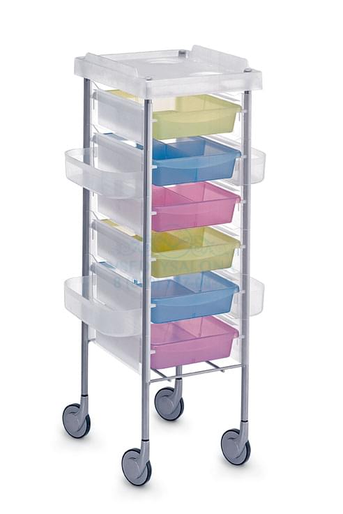 Тележка парикмахерская выполнена из пластика, на колесиках, с выдвижными ящиками. Цвет: серый, черный