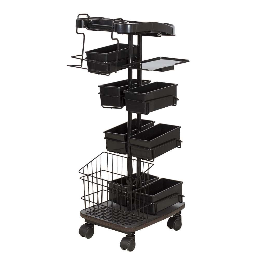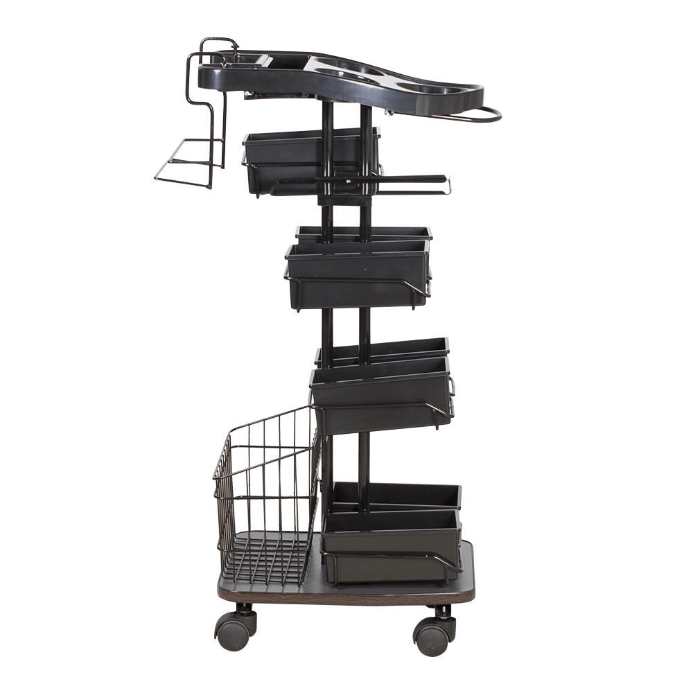 Дополнительные элементы: ручка для перемещения тележки, три отверстия -держателя для чаш, держатель для фольги с отрезным краем, удобные держатели и лотки для кисточек, корзина для использованной фольги.