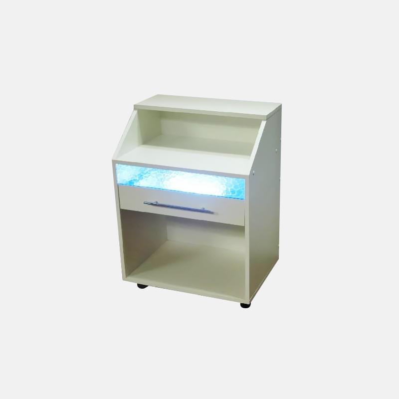 Тумба Исайа являет собой яркий пример мебельной конструкции, в простоте которой и заключается её многофункциональность. Подтвердить это можно наличием бактерицидной УФ лампы, с помощью которой мастер может дезинфицировать рабочие инструменты в достаточно короткий срок. Кроме того, наличие открытых широких полок делает работу мастера ещё эффективнее и проще, ведь он может хранить все необходимые ему материалы под рукой. Передвижная тумба снабжена четырьмя колесиками, что делает процесс эксплуатации ещё проще, при этом заказчик может самостоятельно выбрать цвет изделия, что является очевидным преимуществом.