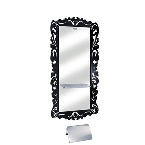 Зеркало парикмахерское одностороннее прямоугольной формы, крепление к стене. Рама выполнена из черного или золотистого пластика, металлическая столешница. Подножка для зеркала заказывается отдельно.