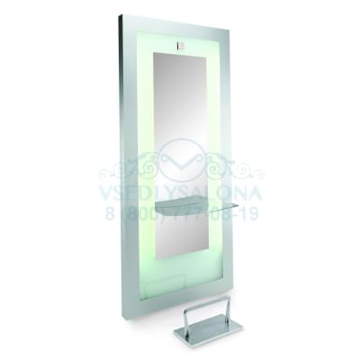 Зеркало парикмахерское, одностороннее, крепление к стене. Металлическая рама с подсветкой, хромированная столешница и подставка под ноги. Размер: 195х85х33,5