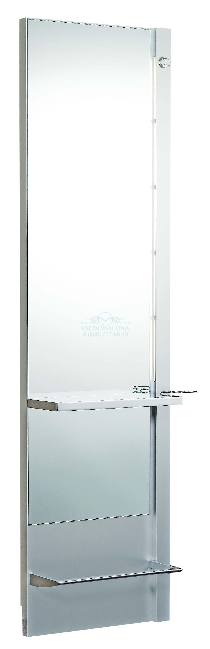 Зеркало парикмахерское в алюминиевой раме или в раме из нержавеющей стали с подсветкой, плоская хромированная столешница с фенодержателем, металлическая подставка под ноги. Крепление к стене. Размер (ДхШхВ): 57х25х210 Дополнительная комплектация: